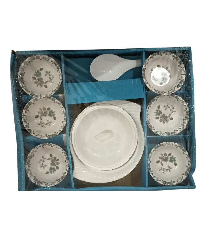 Melamine Dinnerware Set – with Grey Floral Design, Serving Bowl, Plates & Spoons